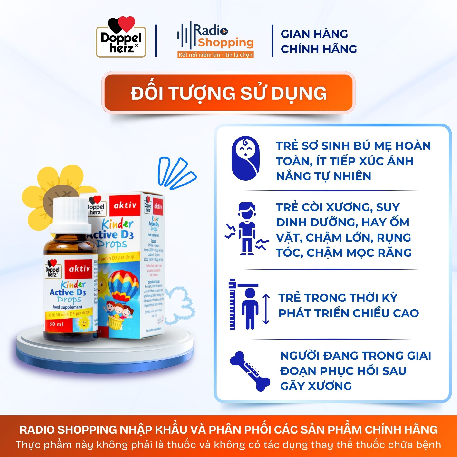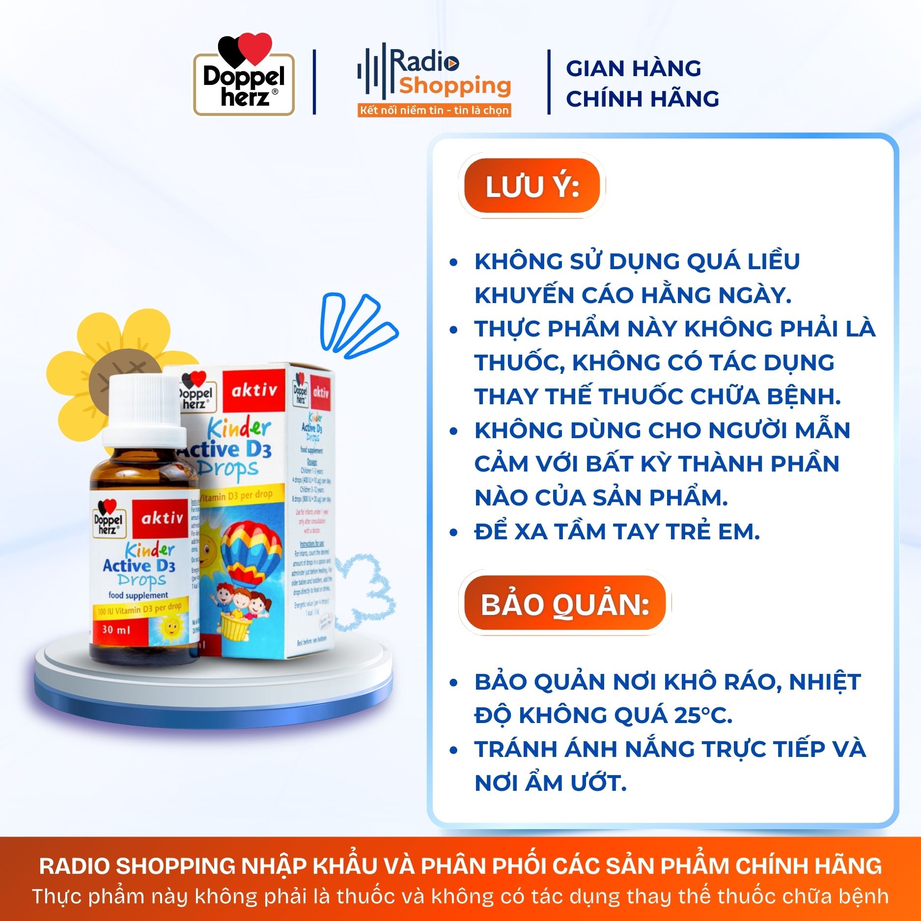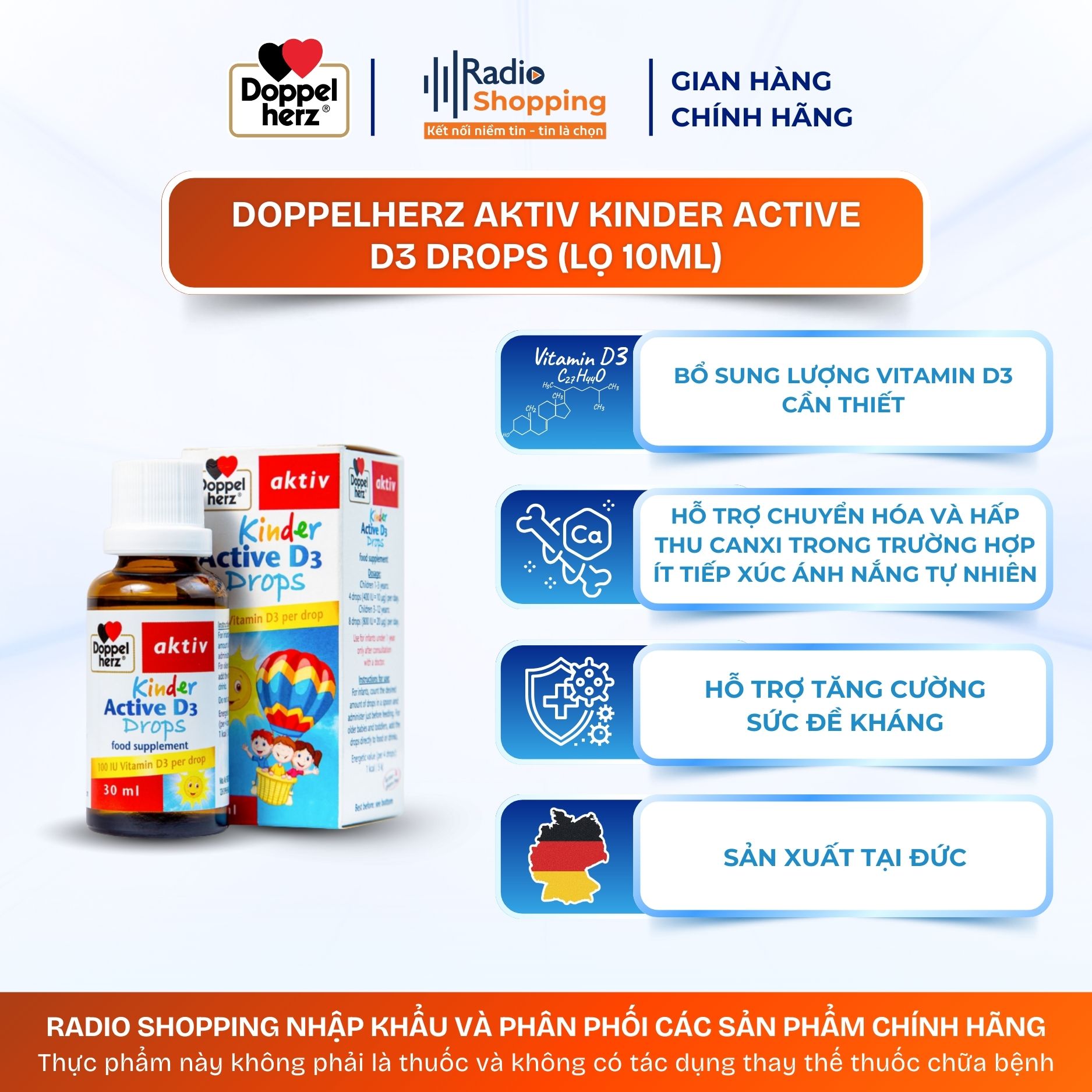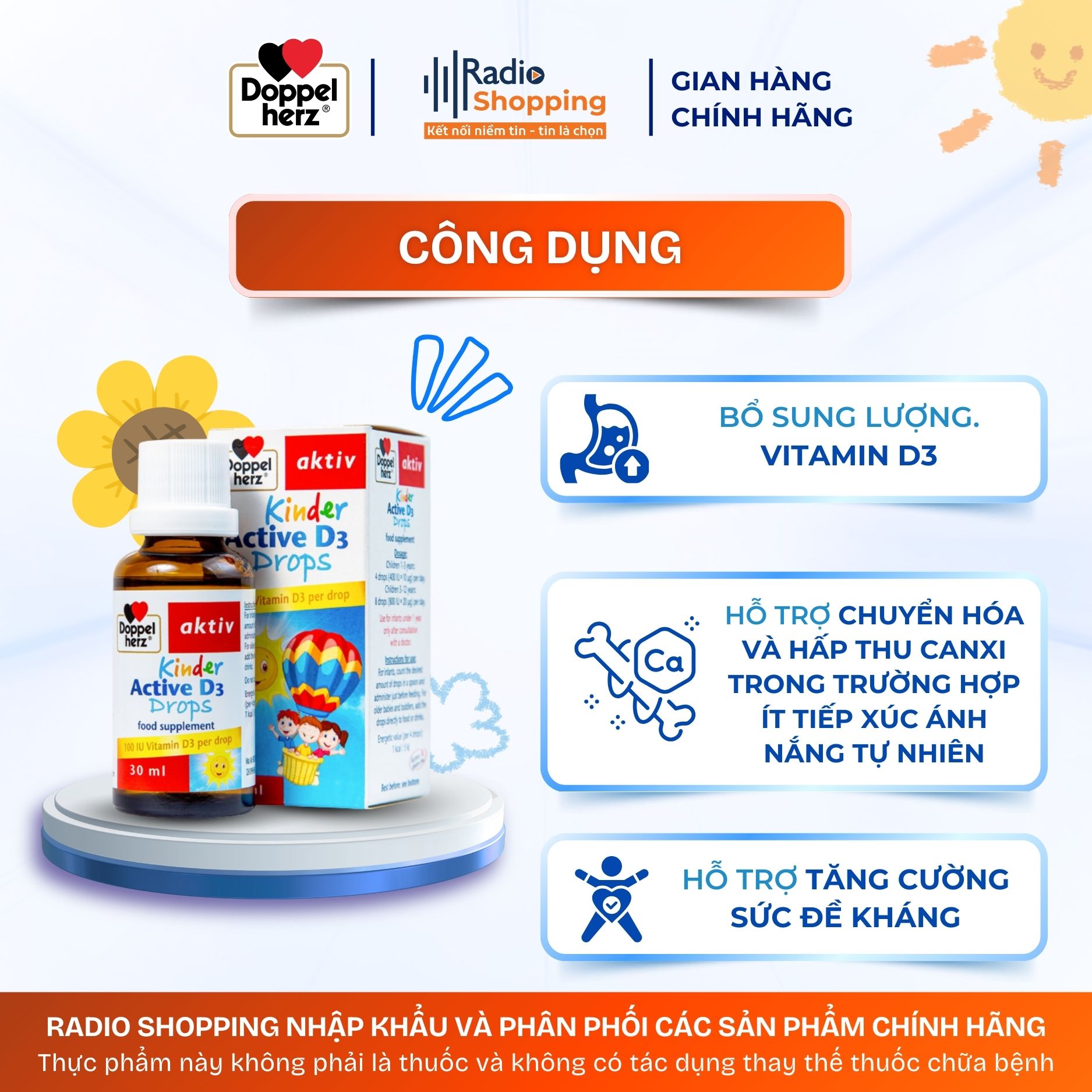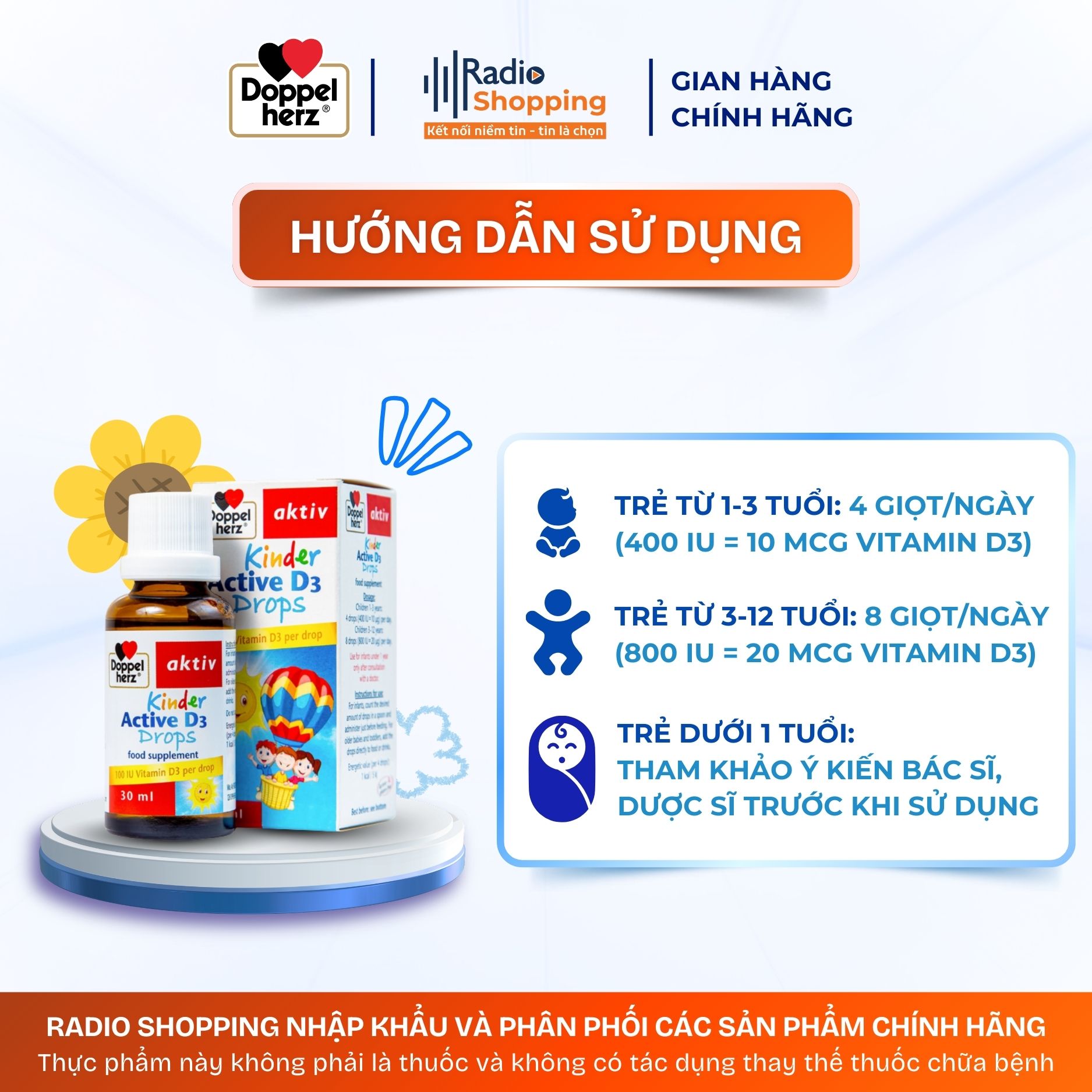 Trẻ 1-3 tuổi: 4 giọt/ngày (400 IU = 10 mcg vitamin D3).