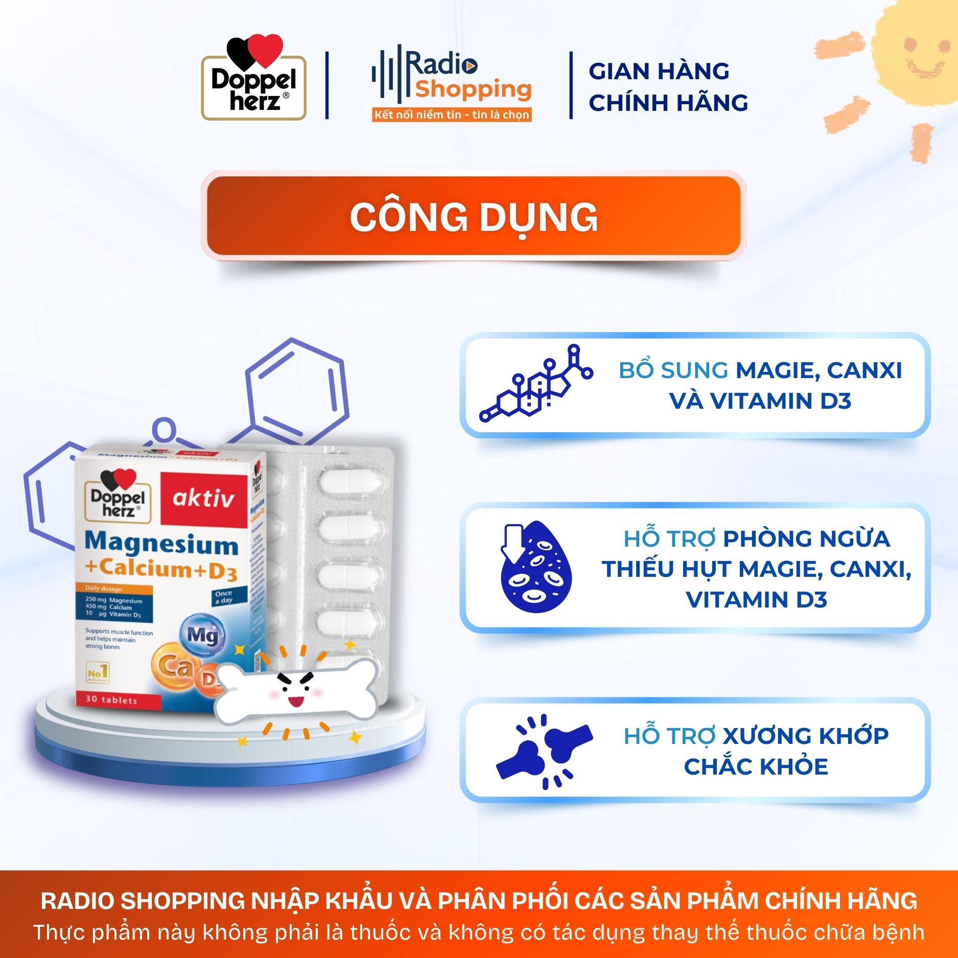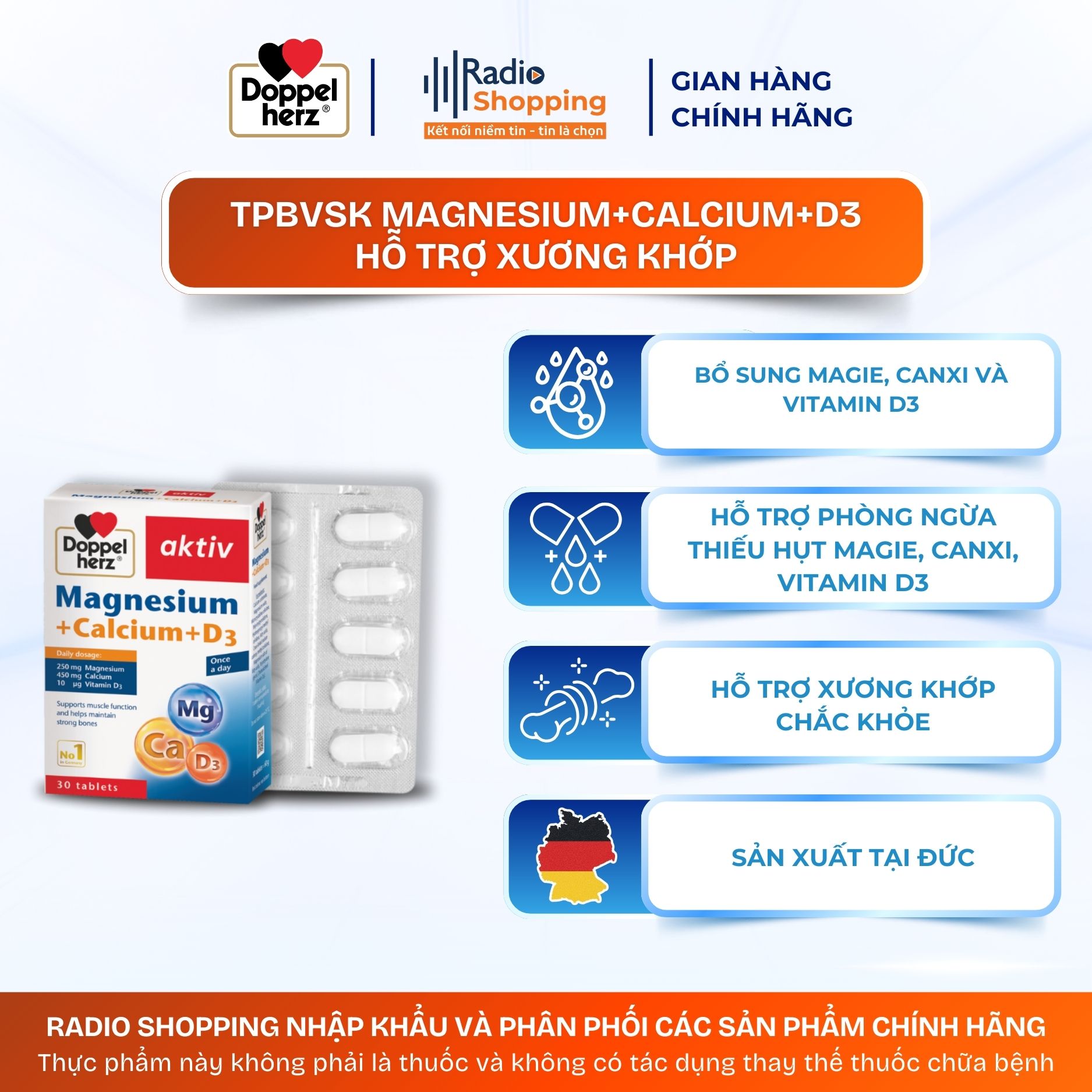 Thực phẩm bảo vệ sức khỏe Magnesium + Calcium + D3 giúp bổ sung Magie, Canxi và Vitamin D3 hỗ trợ phòng ngừa thiếu hụt Magie, Canxi, Vitamin D3 và hỗ trợ xương khớp chắc khỏe.