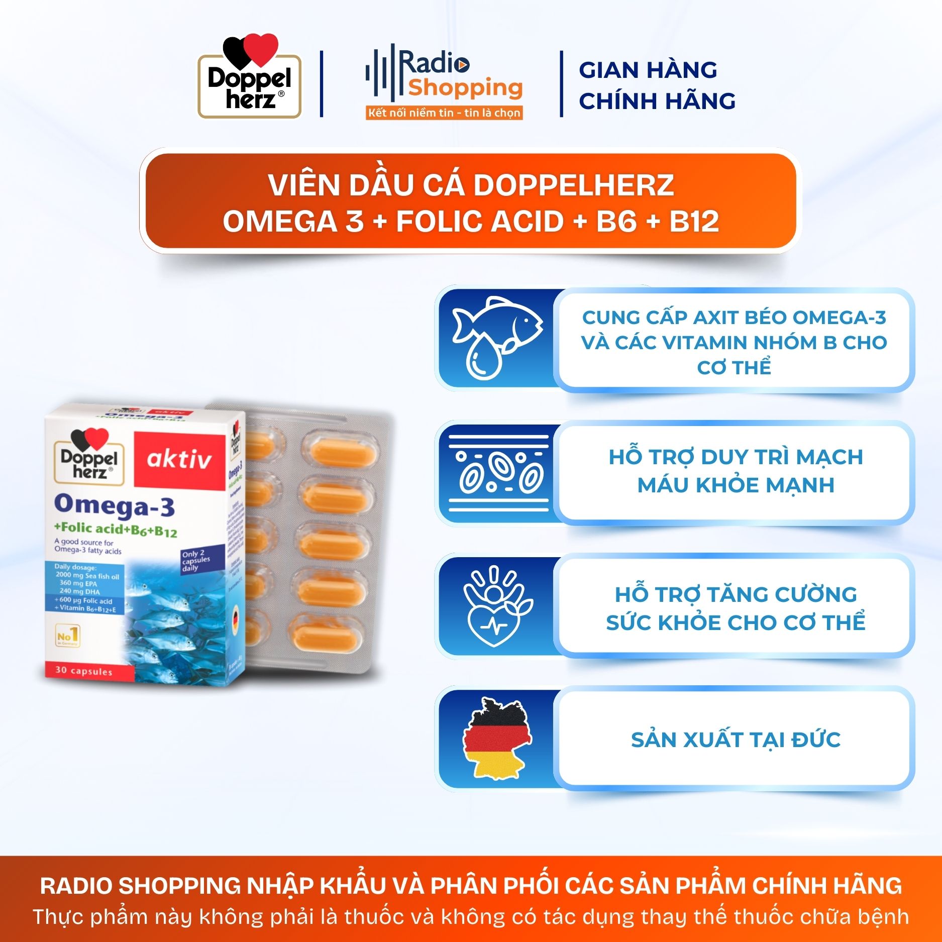 Thực phẩm bảo vệ sức khỏe Omega-3 + Folic acid + B6 + B12 cung cấp axit béo Omega-3 và các vitamin nhóm B hỗ trợ duy trì mạch máu khỏe mạnh và hỗ trợ tăng cường sức khỏe cho cơ thể.